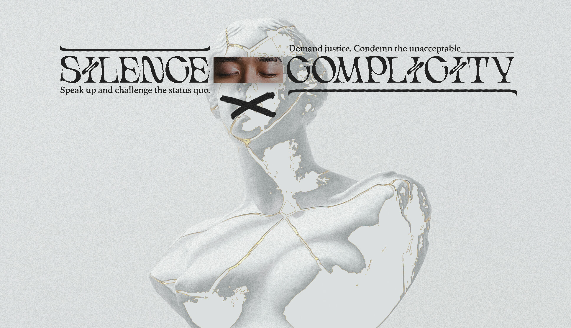 The artwork „Silence = Coplicity“ features a female Greek statue, a symbol of beauty, grace, and wisdom. Yet, over her eyes, we see the closed eyes of a man, representing the idea that silence and inaction in the face of injustice is a form of complicity. The closed eyes suggest a refusal to see, acknowledge, or confront the uncomfortable truths and realities that exist in the world today. This artwork serves as a powerful reminder that we must not turn a blind eye to the injustices around us, but instead, speak out and take action to create a more just and equitable world.